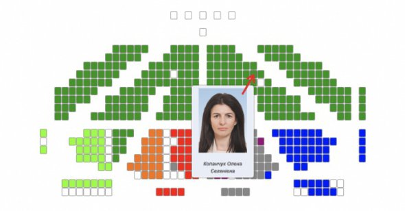 Робоче місце Копанчук знаходить у четвертому ряду третього сектора сесійної зали, якщо рахувати зліва направо. Депутатка натиснула на кнопку пульта Рубльова, який сидить праворуч. Це сталося о 13:32 під час голосування за законопроект №1052 про будівельні норми щодо удосконалення нормування у будівництві.