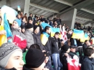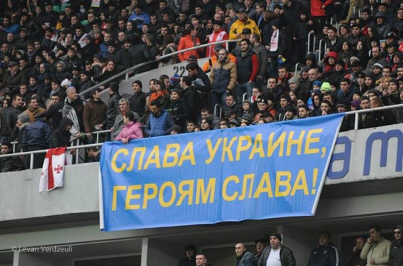 А на трибунах стадіону Динамо -Арена грузинські вболівальники вивісили українські прапори і плакати " Слава Україні! Героям слава!" в знак солідарності з українським народом.