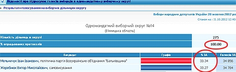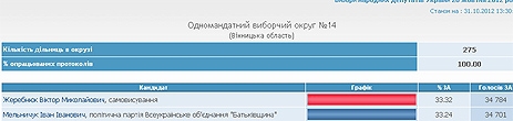 Так ще вранці після обробки 100% протоколів кандидат від Батьківщини Іван Мельничук отримав 33,41% , а його опонент самовисуванець Віктор Жеребнюк – 33,21%. Розрив складав 194 особи, пише "Українська правда".