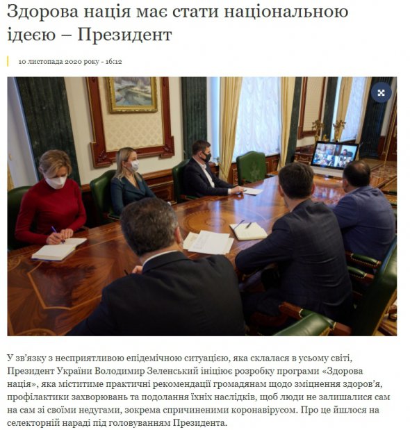 Новина під заголовком "Здорова нація має стати національною ідеєю – Президент".