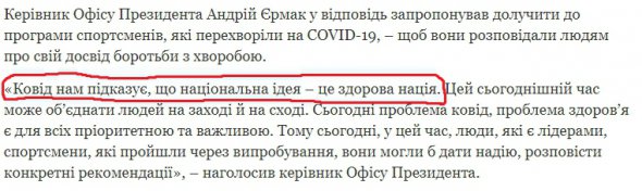 Натомість є цитата Єрмака: "Ковід нам підказує, що національна ідея – це здорова нація".