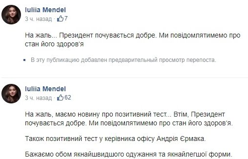 Учора у скандал потрапила прес-секретарка президента Юлія Мендель. Спочатку на її сторінці у Facebook з'явилося повідомлення про захворювання на Covid-19 президента з текстом: "На жаль… Президент почувається добре".