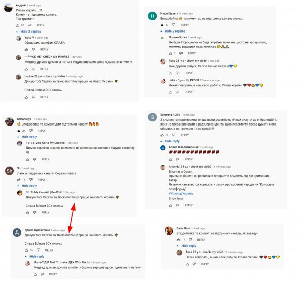 "Тисячі явно фейкових акаунтів пишуть схвальні коментарі під відео. Потім інші боти одночасно кидають на канал скарги щодо накрутки активності. І алгоритми Ютуба блокують канал. Раніше за подібною схемою вже блокували Оm TV UA. Я вже повідомив адміністрацію соцмережі про це, але ваш розголос буде також не зайвим", - розповів Стерненко і опублікував приклад атаки у нього під відео.