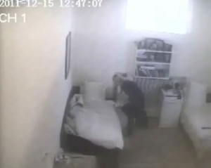 На запису видно як жінка вільно ходить по камері, поправляє ліжко, дивиться у дзеркало. А після того, як, певно, у двері хтось стучить, вона лягає в ліжко. Потім, коли встає, заледве пересувається, тримаючись за поперек.