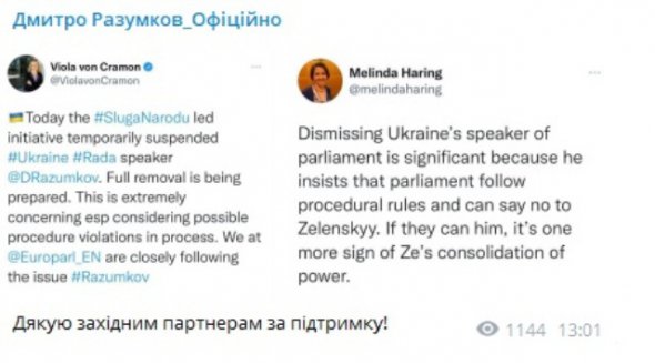 Голова Верховної Ради України Дмитро Разумков опублікував заяву делегата Німеччини в ПАРЄ Віоли фон Крамон-Таубадель про занепокоєння з приводу можливих порушень за його відставки.