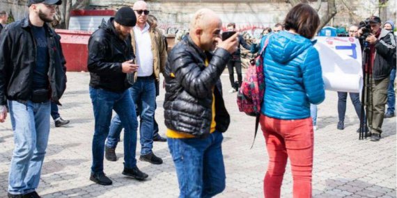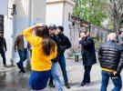 Нечистоти вилили з відра зверху арки театру на голови Мустафи Найєма та делегації, коли вони входили всередину. Киян закидали гумовими фаллоімітаторами.