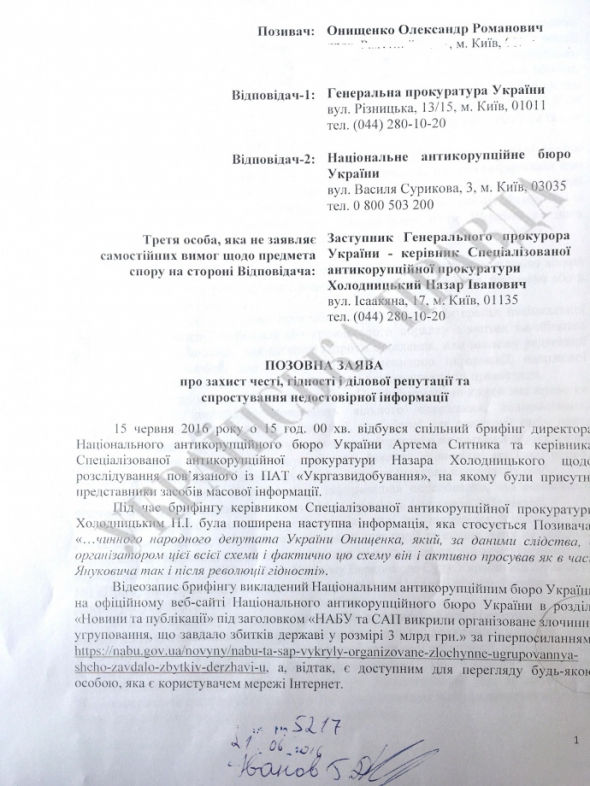 У позові Онищенко вказує, що 15 червня під час брифінгу керівник Спеціалізованої антикорупційної прокуратури Назар Холодницький назвав його організатором злочинної схеми.