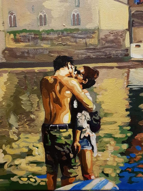 "Раніше, бувало, шокувала співрозмовників заявами, що жодного разу не була в ЄС. У Чечнях-Осетіях була, а в Європі ні. Після Майдану теж принципово чекала безвізу (я не вважаю пару коротких робочих поїздок як-то в Латвію за "активами Януковича", чи до Гамбургу за премією журналісту, недобитого Януковичем). Одним словом, Європу не бачила. А ось цьогоріч із новим паспортом вирішила з позиції переможця нарешті відкрити Європу. Вибрала Італію, бо туди їздять художники, і мені захотілося. Тому цю картину я жартома називаю "Безвіз", - розповіла нардеп.