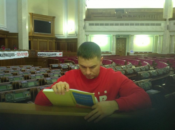 Народний депутат від фракції УДАР Павло Розенко на своїй сторінці в Фейсбуці опублікував фото, де його колега Олександр Мочков у парламенті тримає в руках Регламент Верховної Ради України з підписом: "Чергуємо та готуємось до протистояння з опонентами в правовому полі!".