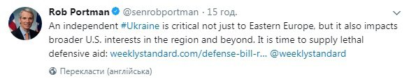 "Незалежна Україна має важливе значення не тільки для Східної Європи, але також впливає на більш широкі інтереси США в регіоні та за її межами. Настав час надати смертоносну оборонну допомогу", - написав Портман.
