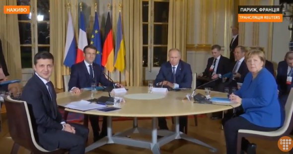 У них беруть участь президент України Володимир Зеленський, президент РФ Володимир Путін, канцлер Німеччини Ангела Меркель і президент Франції Емманюель Макрон.