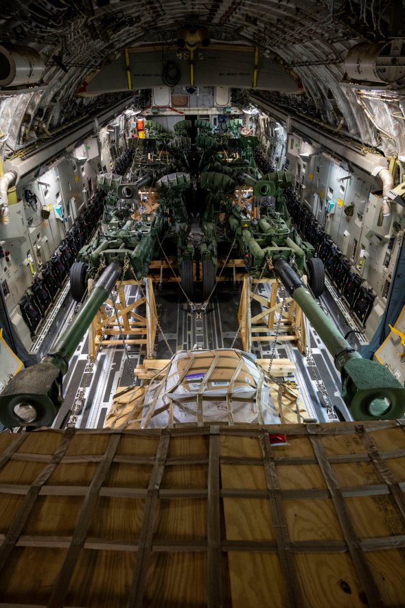 "155-мм гаубиці M777, що буксируються, закріплені для транспортування в Україну авіакомпаніями United States Air Force в рамках допомоги США в сфері безпеки", - повідомила пресслужба міністерства оборони США у фейсбуці.