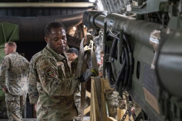 20 травня американські гаубиці M777 для України завантажили на військово-транспортний літак C-17 на базі повітряного резерву Марш. До цього залучили, зокрема, військовослужбовців Повітряних сил США.