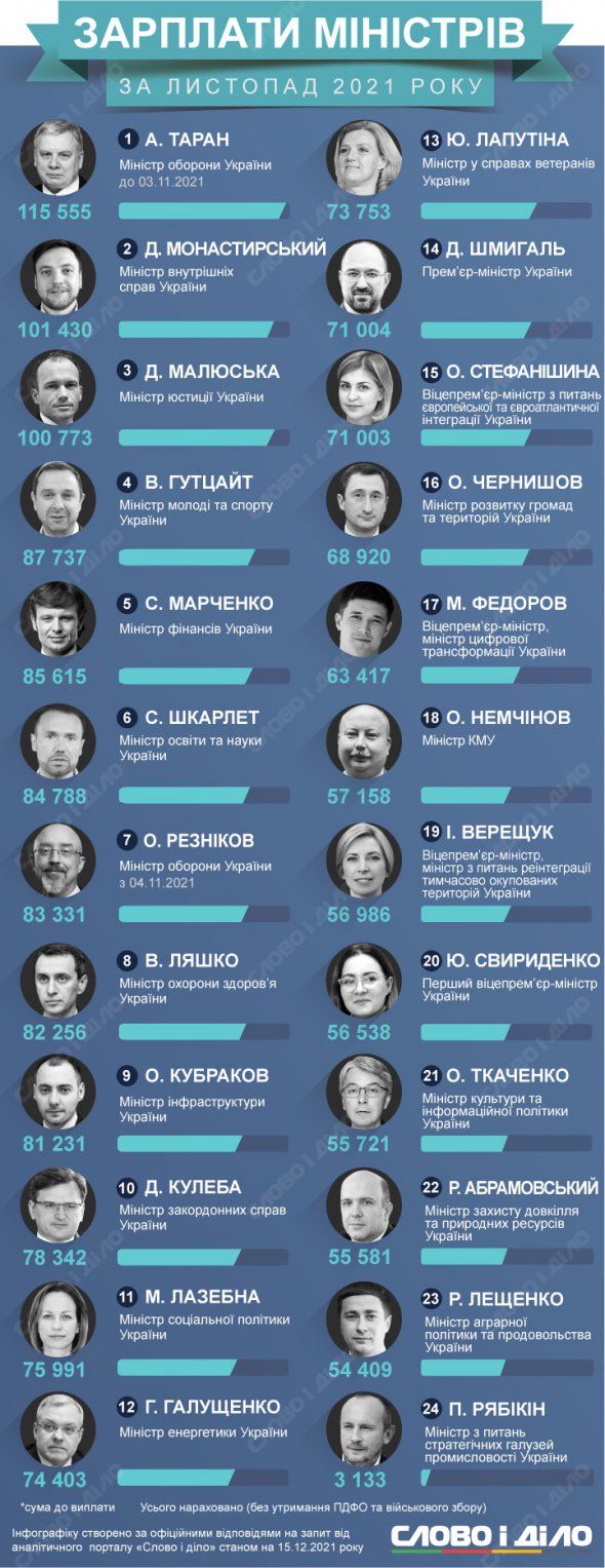 Прем'єр-міністр Денис Шмигаль заробив 71 тис. грн. А найменша зарплата була у новопризначеного міністра з питань стратегічних галузей промисловості Павла Рябікіна – лише 3 тис. 133 грн.