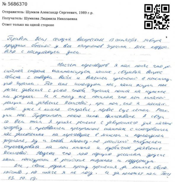 "…Я прийняв рішення з завтрашнього дня розпочати голодування з вимогою припинити шантаж з використанням нас, ув'язнених, на перемовинах в "мінському" та "нормандському" форматах, і щоб нарешті російський омбудсмен зреагувала на мої листи та публічні заяви Денісової. Сподіваюсь, що мою позицію почують інші наші політв'язні в російських в'язницях та підтримають", - написав Шумков у листі, що його оприлюднила у Facebook тітка ув'язненого українця Людмила Шумкова.