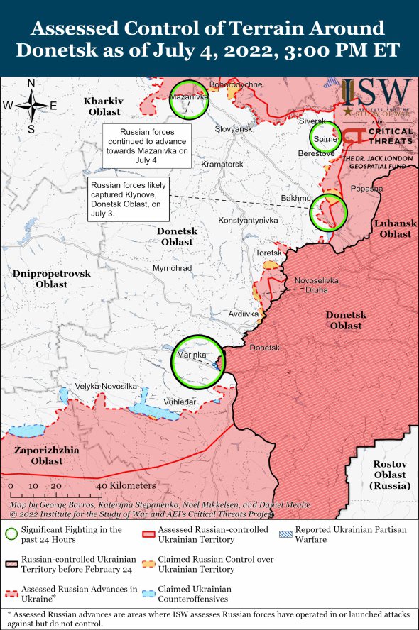 Російське керівництво може висувати умови для оперативної паузи після захоплення Лисичанська та кордону Луганської області, повідомляє у щоденному звіті Інститут вивчення війни (ISW).
