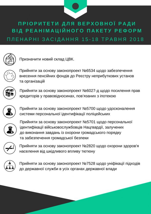 З 15 по 18 травня парламент має 7 пріорітетів, повідомляють у "Реанімаційному пакеті реформ".