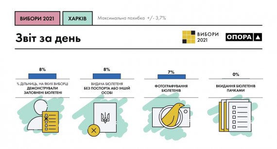 Найбільш популярними порушеннями у день голосування були видача бюлетенів без паспорта, демонстрування виборцями результатів волевиявлення і спроби фотографування заповнених бюлетенів.