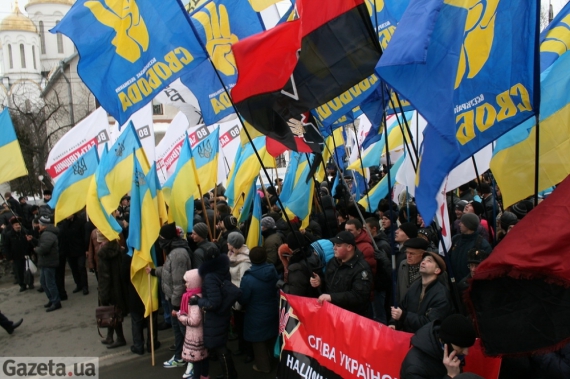 Опозиціонери почали мітинг в Тернополі поклонившись пам?ятнику Бандері, а завершили, традиційно, співом національного гімну.