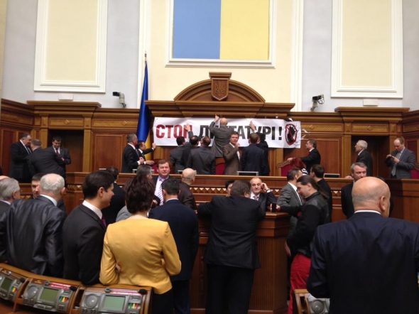 Як повідомляє кореспондент Gazeta.ua, вони розвісили плакат "Стоп диктатурі!" за спинами членів президії.