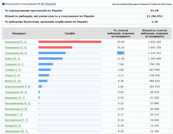 Згідно з останніми підрахунками, Зеленського підтримали 3 425 145 виборців, що становить 30.40%.