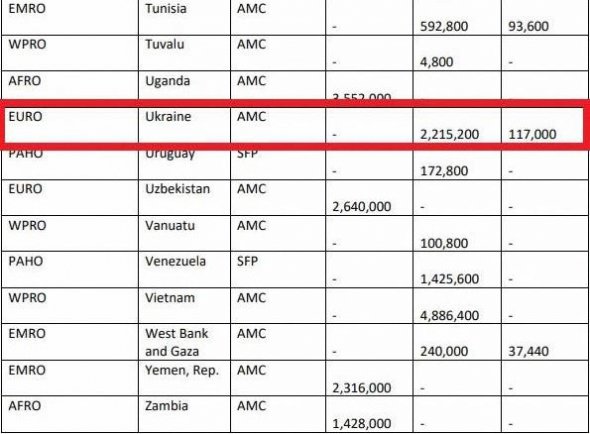 "18 країн першими отримають 1,2 мільйона доз вакцин Pfizer/Biontech в рамках програми COVAX: Бутан, Болівія, Боснія і Герцеговина, Кабо-Верде, Колумбія, Сальвадор, Грузія, Мальдіви, Молдова, Монголія, Перу, Філіппіни, Республіка Корея, Руанда, Південна Африка, Туніс, Україна і Західний берег та Газа", - сказано в повідомленні.