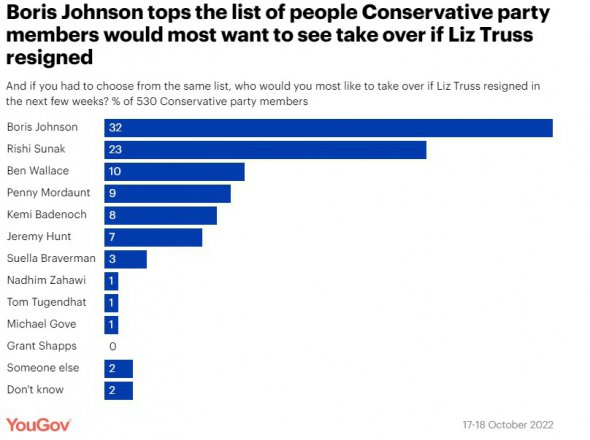 За ним йдуть колишній міністр фінансів Ріші Сунак (23%) і чинний міністр оборони Бен Воллес (10%).