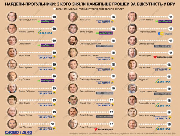 14 нардепів від ОПЗЖ позбавили виплат за прогули. Серед них, Рената Кузьміна, Тараса Козака, Юрія Солода, Вадима Рабіновича і Вадима Столара позбавили виплат за 19 місяців. Інфографіку рейтингу 30 нардепів, у яких вирахували найбільше грошей за відсутність у Верховній Раді, опублікувало видання "Слово і діло".