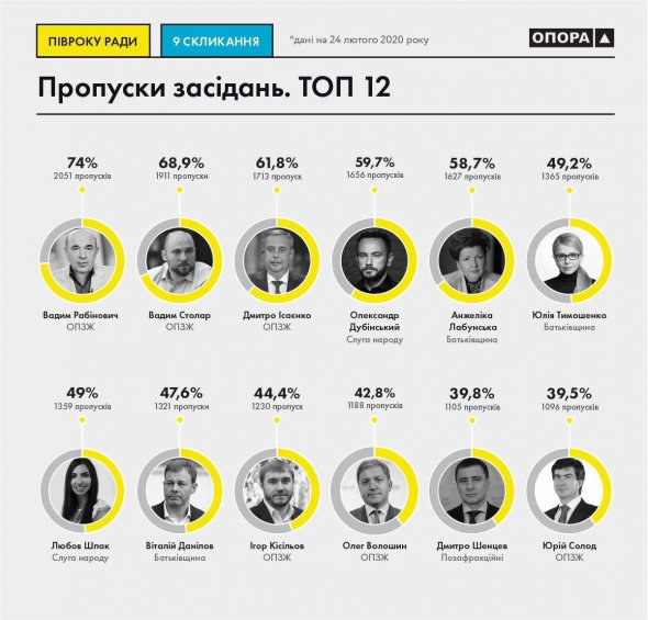 Рекордсмен із прогулів – Вадим Рабінович з ОПЗЖ (74%). На другому та третьому місцях також його колеги по фракції Вадим Столар (68,9%) та Денис Ісаєнко (61,8%).