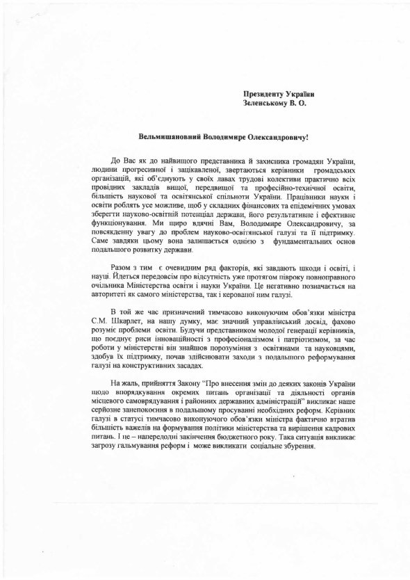 Представники громадських організацій – об'єднання трудових колективів закладів вищої, передвищої та професійно-технічної освіти, ректори українських університетів звернулися з проханням до Президента України Володимира Зеленського призначити Сергія Шкарлета Міністром освіти і науки України.