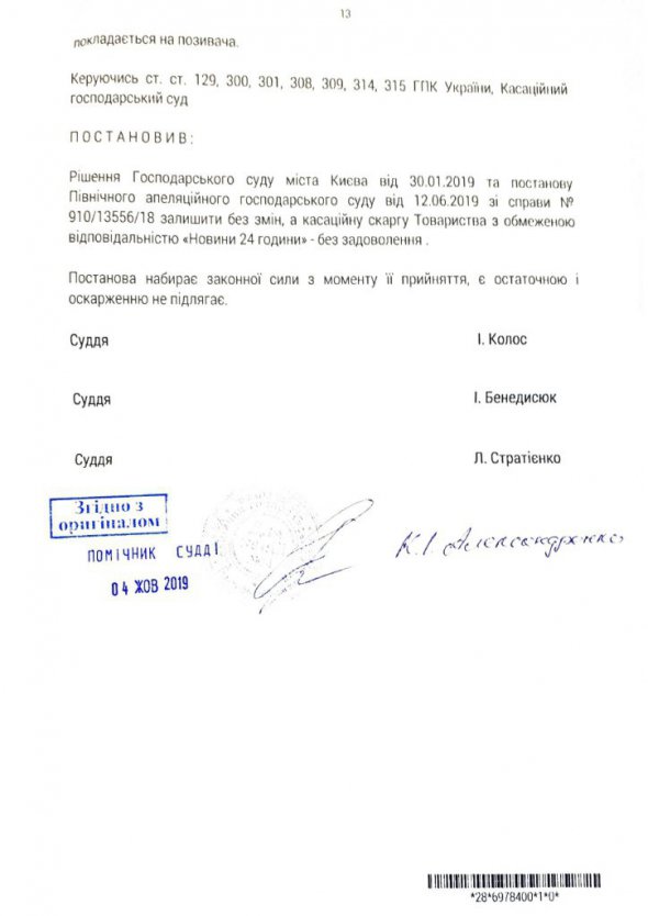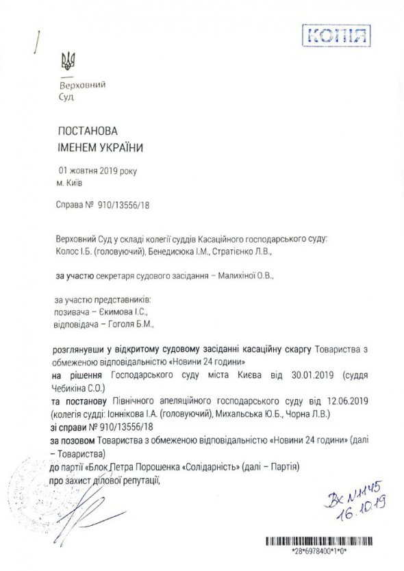 Касаційний господарський суд у складі Верховного суду визначив, що формулювання, які були використані в заяві фракції, про антидержавні і антиукраїнські висловлювання та факти, які ретранслює телеканал "News One", а також про відповідність риторики ЗМІ до "темників Кремля" і меседжів російської пропаганди, є оціночними судженнями і не містять інформації, яка завдає шкоду діловій репутації телеканалу. Про це повідомляє прес-служба "ЄС".