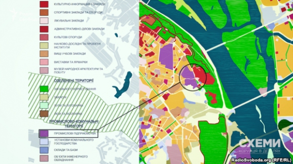Комплекс планують збудувати на землі, яку орендує фірма "Підприємство "Київ". У її структурі знайшли компанії, пов'язані з колишнім бізнес-партнером Петра Порошенка Костянтином Григоришиним, співкерівником виборчого штабу БПП Давидом Жванією та давнім бізнес-компаньйоном Порошенка Олегом Гладковським.