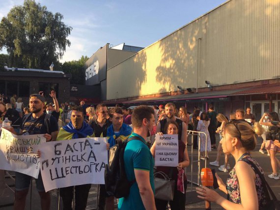 Вчора під стінами Stereo Plaza, що на проспекті Валерія Лобановського, відбулася акція протесту проти концерту. Люди тримали в руках плакати "Баста фінансує російську армію", "Зеленський кришує рашистів", "Крим - це Україна. І на цьому баста!", "Баста - путінська шестьорка".