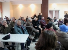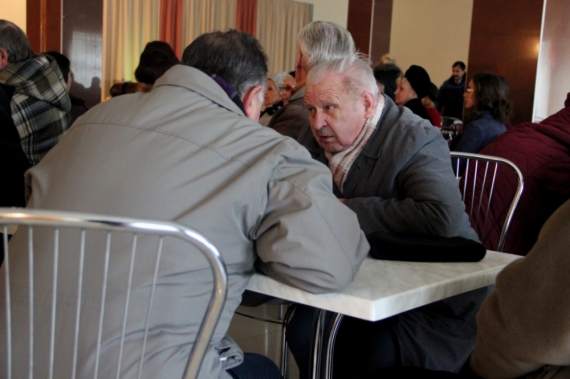 О 13.25 оголошують перерву. Люди йдуть до столів з кавою та булочками. Дехто бере одразу по три булочки. Дехто кладе і в пакет.