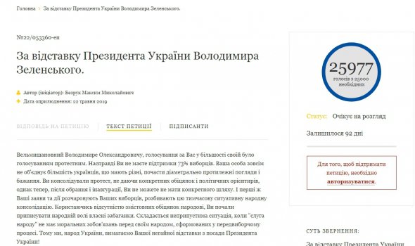 Електронна петиція за відставку президента Володимира Зеленського набрала необхідні 25 тис. голосів. Тепер її має розглянути глава держави.