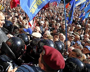 Як передає кореспондент Gazeta.ua, кілька десятків учасників акції протесту стали посеред дороги, але "беркутівці" відтіснили їх до тротуару. Одному з чоловіків машина наїхала на ногу, однак він просто відійшов з дороги. Зараз люди стоять в оточенні кількох сотень "беркутівців".