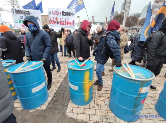 Люди принесли металеві бочки, використовують їхя як барабани. Тримають в руках плакати з надписами "Київ з Порошенком", "We need DEMOCRACY", "Дякуємо", прапори партії "ЄС".