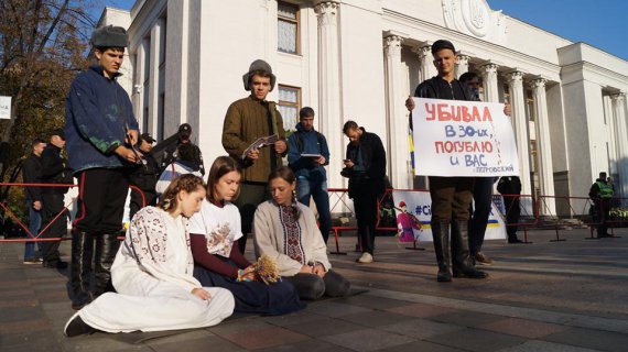 Люди влаштували інформаційний перфоменс - зображали організатора голодомору України Григорія Петровського з плакатом "Убивав у 30-х. Погублю і вас". Також показали образи репресованих українців в оточенні НКВД.