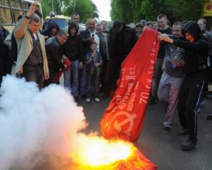 Співробітники міліції спробували розняти сторони, проте прапор у підсумку все-таки опинився в руках представників ВО "Свобода", які його порвали і розтоптали.