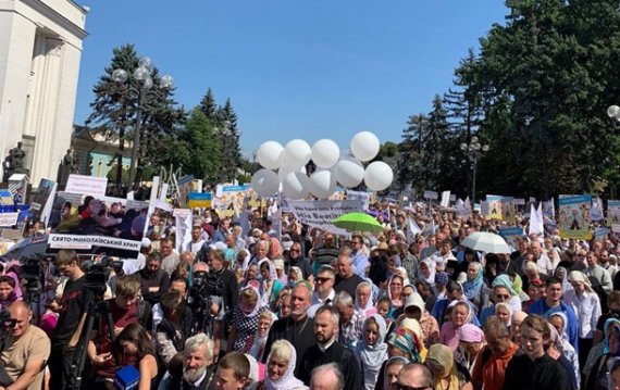 Під Верховною радою, де повинна відбутися зустріч голови парламенту Дмитра Разумкова і Вселенського патріарха Варфоломія, зібралися віруючі Української православної церкви.