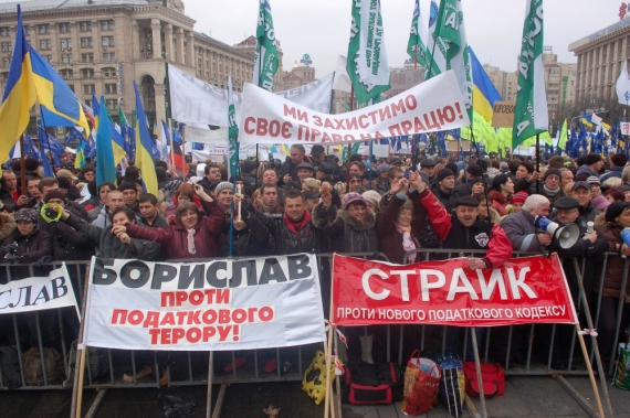 Протести підприємців проти нового Податкового кодексу тривають. Сьогодні на Майдані зібралося понад 10 тисяч представників малого та середнього бізнесу з різних регіонів України. Люди стояли з плакатами "Азаров, руки прочь от базара", "Ні податковому свавіллю". Мітингувальники кричали "Ганьба" та вимагали відставки Верховної Ради.