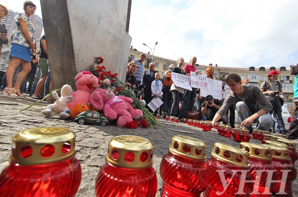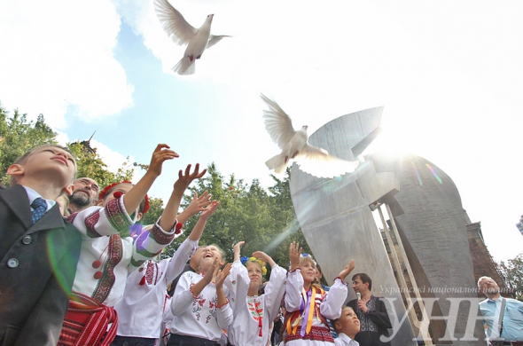 Кілька десятків активістів та школярів прийшли до пам'ятника жертв тероризму для того, щоб вшанувати пам'ять за загиблими під час теракту у Нью-Йорку 11 вересня 2001 року. Акція розпочалася із малюнків патріотичного змісту на асфальті. З десяток дітей різного віку, вбраних у вишиванки, малювали на площі поблизу монументу прапори України і жовто-сині серця, а також писали національні девізи на кшталт "Слава Україні!".