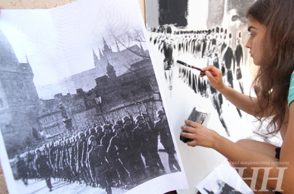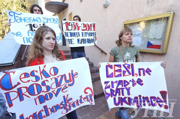 Громадські активісти провели біля Чеської Республіки акцію під назвою "Не допустіть повторення Мюнхенської зради". Нагадаємо, що у Празі у 1939 році була підписана Мюнхенська угода, яка дістала назву "Мюнхенська зрада". Основною умовою угоди була передача Німеччині Судетської області, внаслідок чого через рік Чехословаччина втратила свою незалежність та була повністю окупована німецькими військами. Сьогодні художники намалювали картину, яка є копією фотографії гітлерівських військ на Карловому мосту у Празі. Цю картину родичі солдатів вручать чеським дипломатам. Вона слугуватиме символічним закликом не допустити повторення подібної історії в Україні.