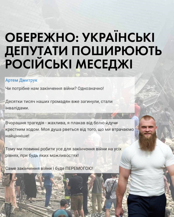 "На дитячу лікарню летять російські ракети, а нардеп Дмитрук закликає до миру з терористами. Після вчорашньої атаки і комунікації окремих публічних людей стало очевидно, що російська інформаційна кампанія проти України вийшла на новий рівень. Якось навіть не дивно, що такі шкідливі для країни наративи транслюють саме наші фігуранти. Для народного депутата Артема Дмитрука, наприклад, "перемогою буде закінчення війни". Судячи з активної підтримки московської церкви, на таку "перемогу" він чекає дуже давно", - пишуть BIHUS.Info.
