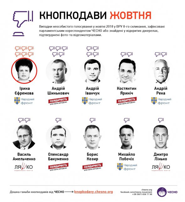 Щонайменше 6 разів кнопкодавила колишня народна депутатка від "Народного Фронту" (склала повноваження 4 жовтня), а нині член Центральної виборчої комісії Ірина Єфремова, 5 разів – Андрій Шинькович із БПП.