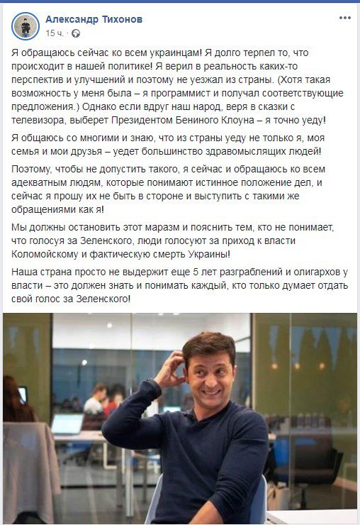 "Я звертаюся зараз до всіх українців! Я довго терпів те, що відбувається в нашій політиці! Я вірив у реальність якихось перспектив і покращень і тому не виїжджав з країни. Проте якщо раптом наш народ, вірячи в казки з телевізора, обере президентом Беніного Клоуна – я точно поїду!
