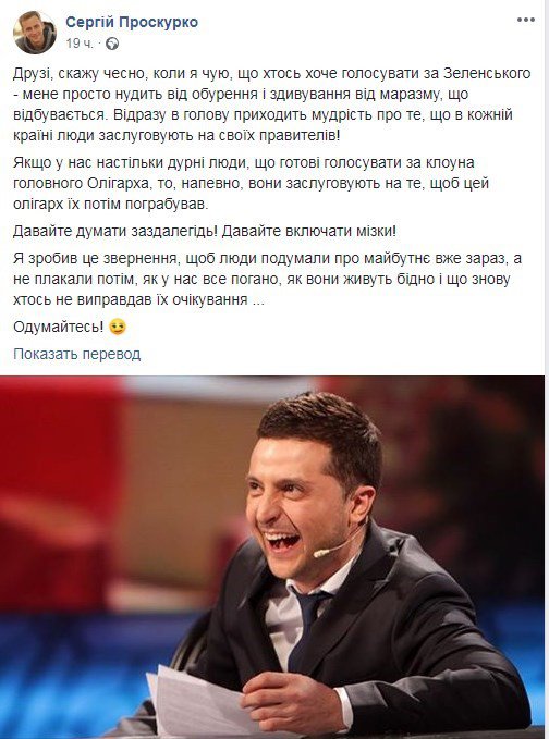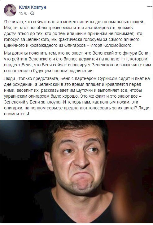 Користувачі в мережі намагаються пояснити тим, хто не розуміє, що, голосуючи за Зеленського, люди фактично голосують за збереження олігархічної моделі функціонування держави і посилення влади "господаря" Зеленського – одного з найяскравіших олігархів – Ігоря Коломойського.