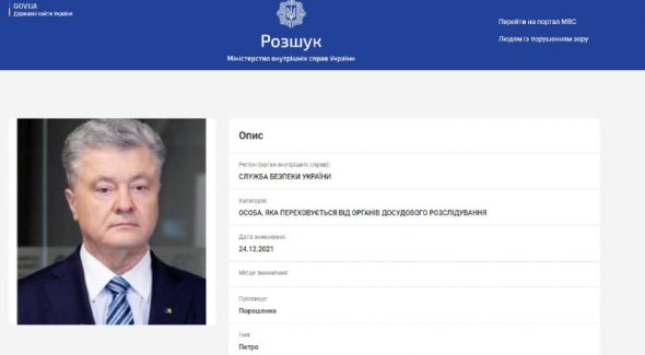 Станом на 20:00 17 січня інформації про розшук Порошенка на сайті МВС вже немає. Політика, імовірно, прибрали зі списку розшукуваних МВС осіб.