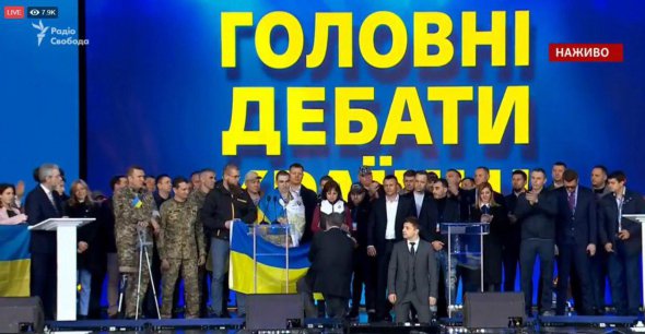 Президент Петро Порошенко і кандидат у президенти Володимир Зеленський стали на коліна перед народом на стадіоні "Олімпійський".