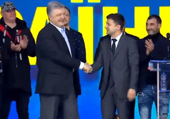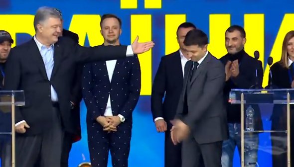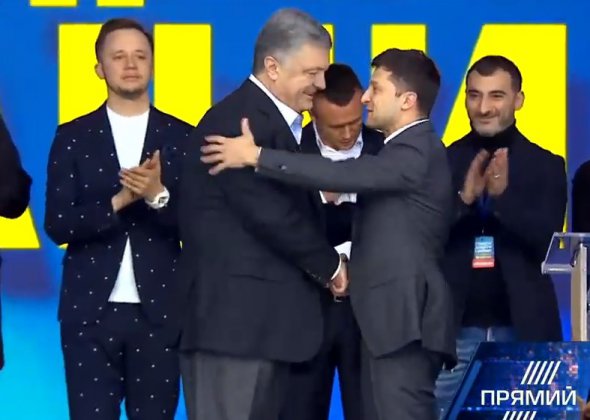Президент Петро Порошенко піднявся на сцену кандидата у президенти Володимира Зеленського і обійнявся із ним.